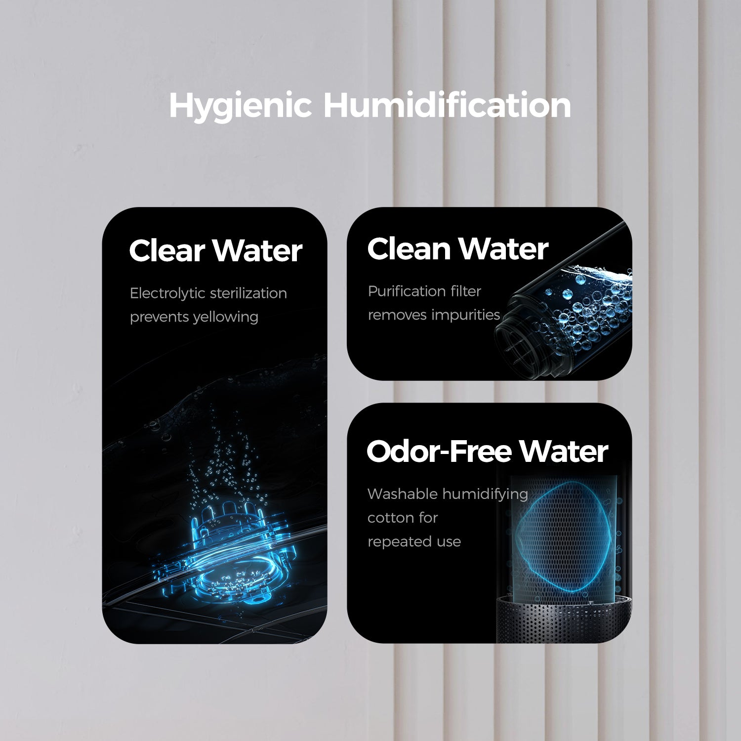 Dual System in Action:Clean air and purified water meet in the humidifying cotton, then get dispersed through the dual-layer turbine fan—delivering fresh, humidified air throughout your space.