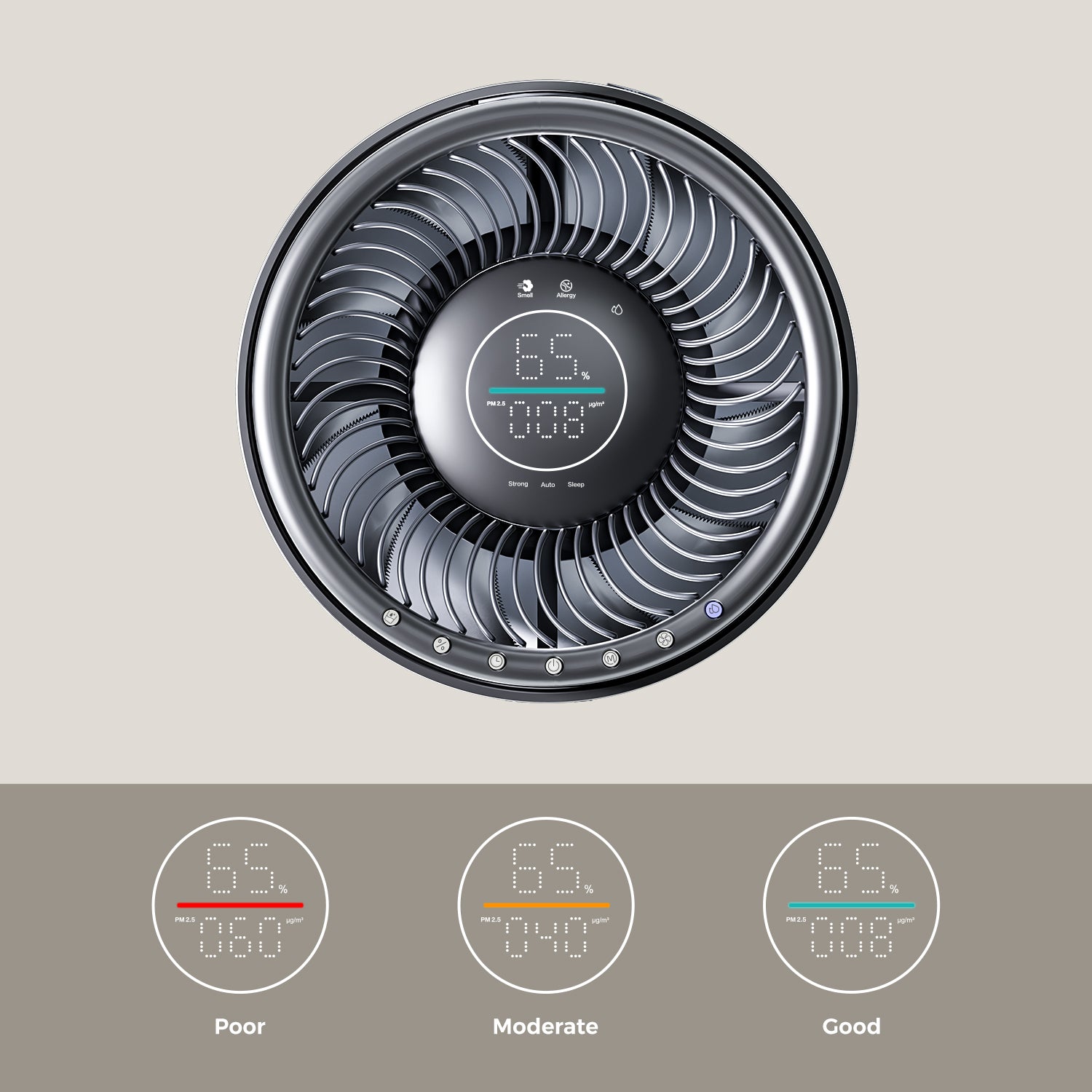 The fan’s speed reflects air quality, giving you instant insights into your environment.